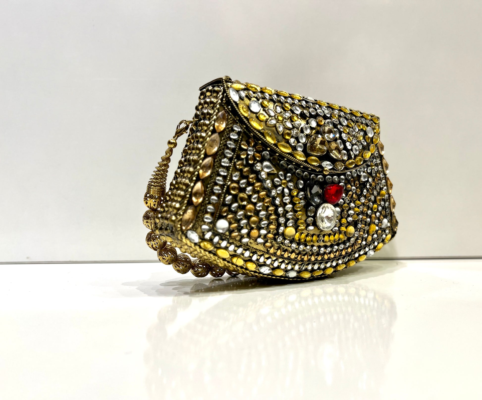 Cette pochette ornée de cristaux étincelants et de détails dorés ajoute une touche d'élégance et de sophistication à votre style. Compacte et parfaite pour les soirées et occasions spéciales, elle vous fera briller avec charme. L'accessoire idéal pour compléter votre tenue avec élégance.