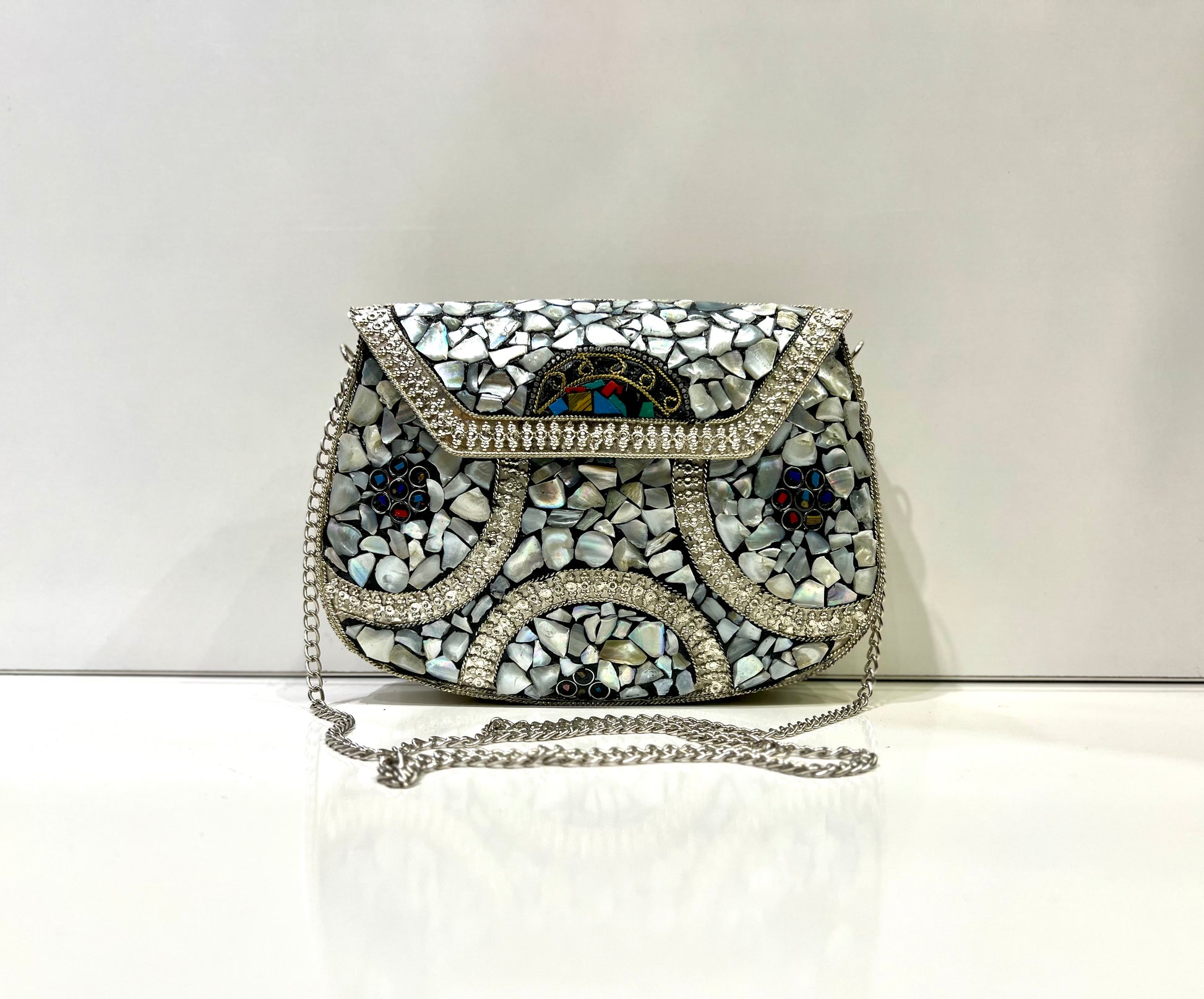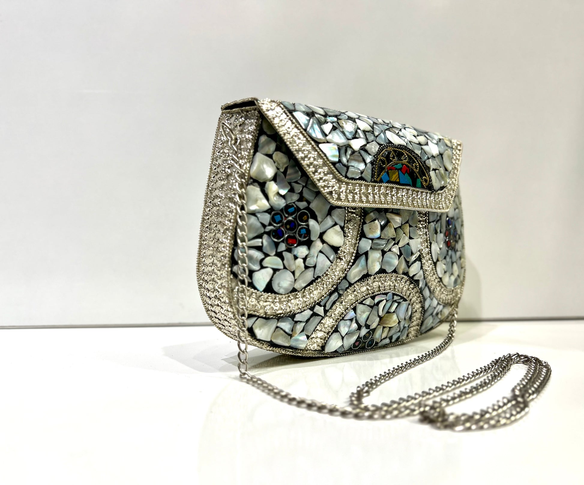 Faites tourner les têtes avec notre Sac à bandoulière en métal argenté avec une mosaïque multicolore. Fabriqué à la main, cette pochette est un véritable chef-d'œuvre qui ajoutera une touche d'éclat et de couleur à toutes vos tenues. Élégant et unique, c'est un accessoire indispensable pour tous ceux qui ont le souci du détail.