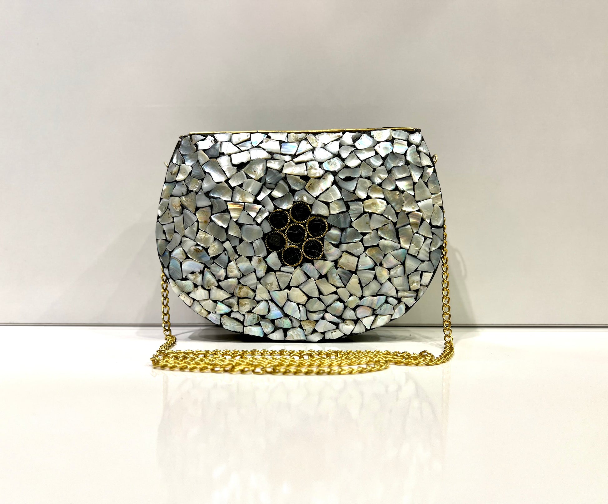 Ce sac à bandoulière en métal avec motif mosaïque est une pochette boho artisanale qui ajoute une touche de style unique à toutes les tenues. Avec sa pierre décorative verte et sa chaîne en métal, ce sac met en valeur l'artisanat et le design fait à la main, tout en offrant une option pratique pour transporter vos essentiels.