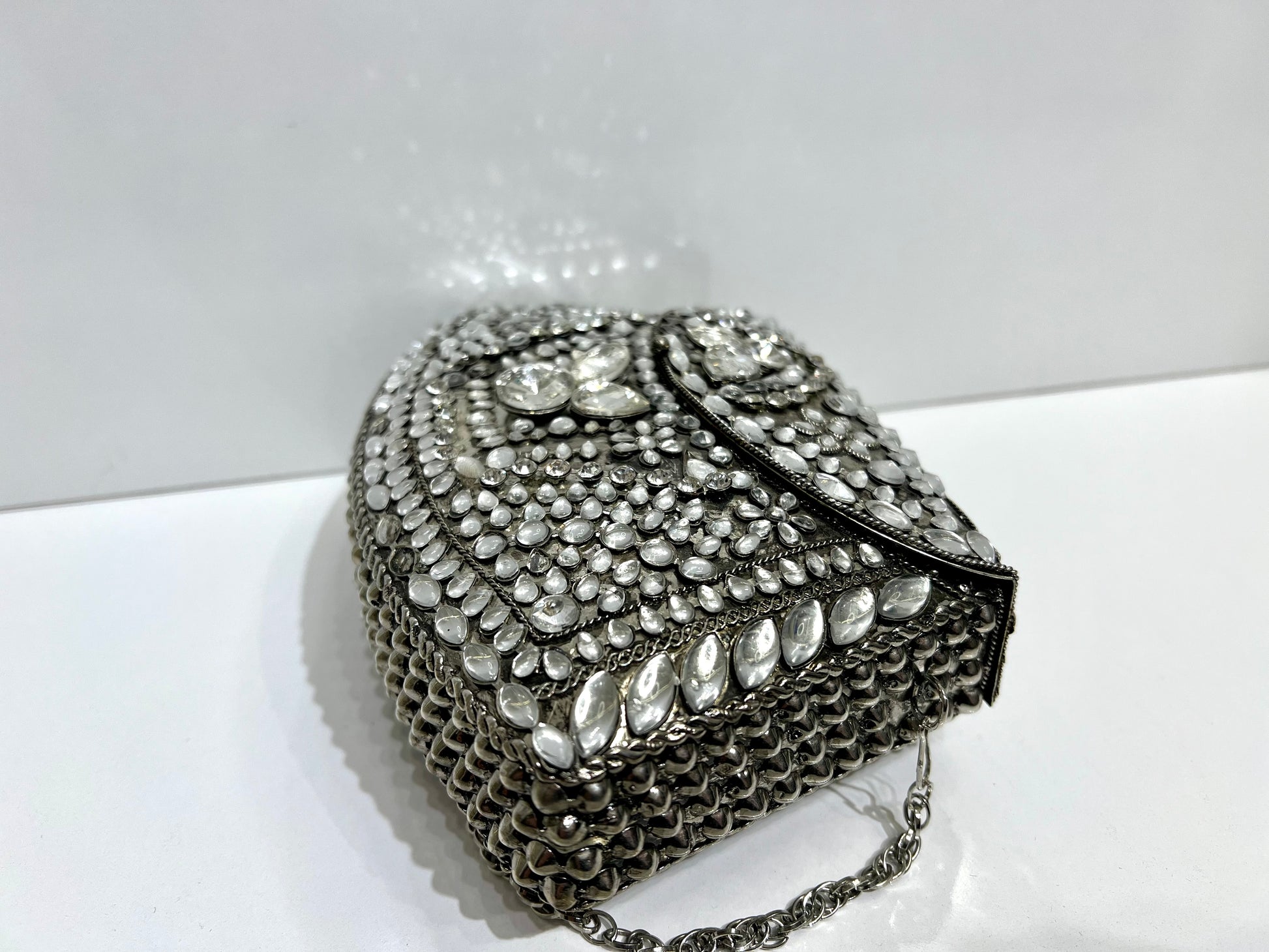 Sac à main en argent orné de cristal, fait à la main avec un design élégant et raffiné. Fabriqué en métal de haute qualité, ce sac offre une touche de sophistication à toute tenue. Parfait pour les occasions spéciales, ajoutez une note de glamour avec ce sac à main en argent fait à la main.